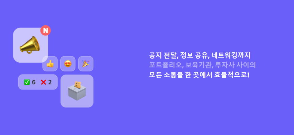 쉽게 말해 스타트업을 대상으로 투자 및 보육 활동 중인 기관에 필요한 모든 커뮤니케이션을 돕는 올인원 플랫폼입니다. 기존에는 여러 채널로 커뮤니케이션해야 했는데, 이를 일원화시킨 것이죠. 또 여러 채널로 소통하다 보니까 휘발되는 경우도 없잖아 있었어요. 이런 부분을 해소했습니다.